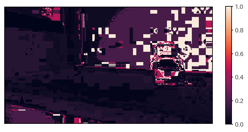 この確率画像を見てみると、物体が存在しそうな領域で大きな値を持っていることが確認できる。確率画像は、ブロック状の領域に分割され安い傾向があるので、実際に使用する際にはGaussianフィルタ等で平滑化すると良い。